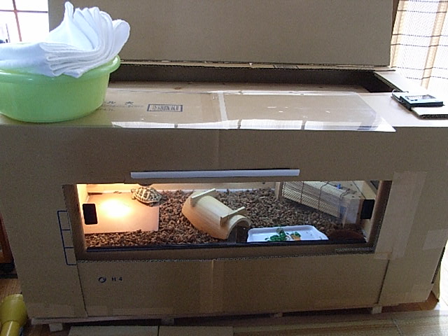 そこで保温対策開始です。飼育ケージの周りを一回り大きなダンボールで囲い、