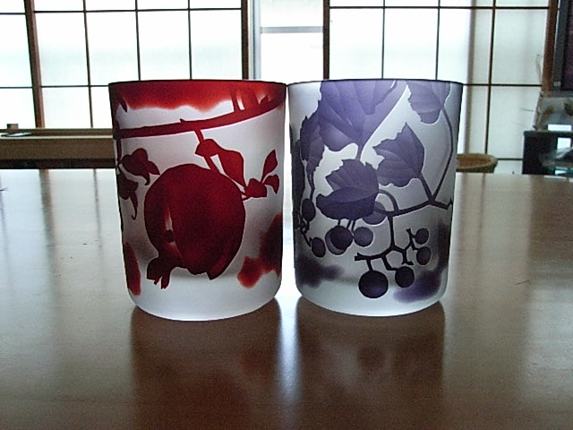 そして2点目がこのグラス。左の赤い石榴がかみさん用に今回買ったもの。右の紫の
